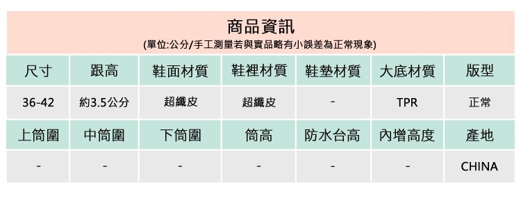 2.鞋類商品依功能及用途之不同,鞋底各有其止滑係數之個別不同,使用鞋類商品請用於正常平坦之路面,非雨鞋或雨靴類商品,請避免穿著於下雨濕滑路面上行走。