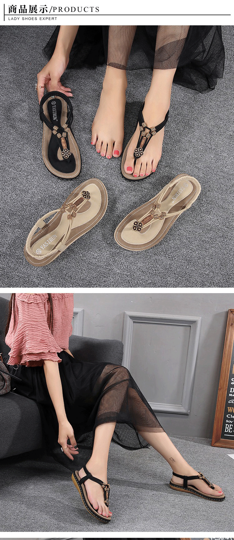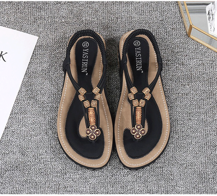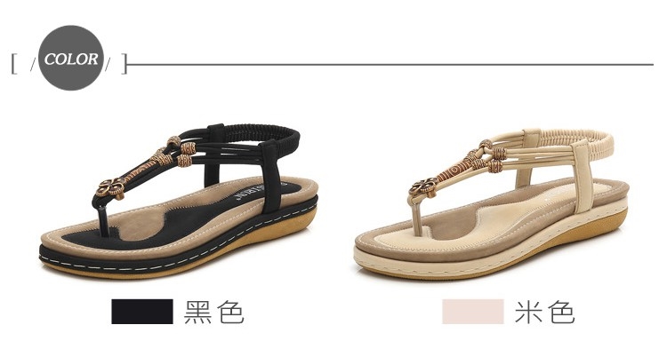 【QUEENA】民族風圖騰串珠線繩舒適厚底T字羅馬涼鞋 黑
