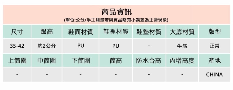 2.鞋類商品依功能及用途之不同,鞋底各有其止滑係數之個別不同,使用鞋類商品請用於正常平坦之路面,非雨鞋或雨靴類商品,請避免穿著於下雨濕滑路面上行走。