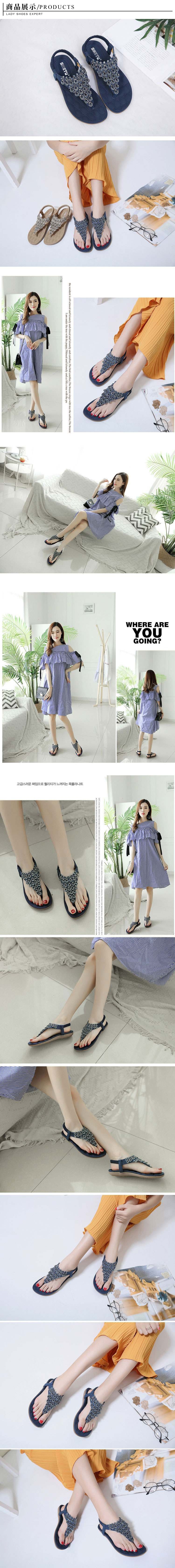 【QUEENA】波希米亞民族風立體美鑽平底舒適羅馬涼鞋 藏青