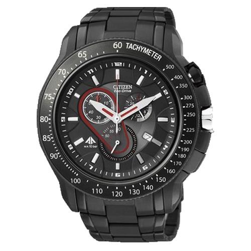 【CITIZEN 星辰】光動能三眼男錶 黑鋼錶帶 黑色錶面 防水100米(AT0719-55E)