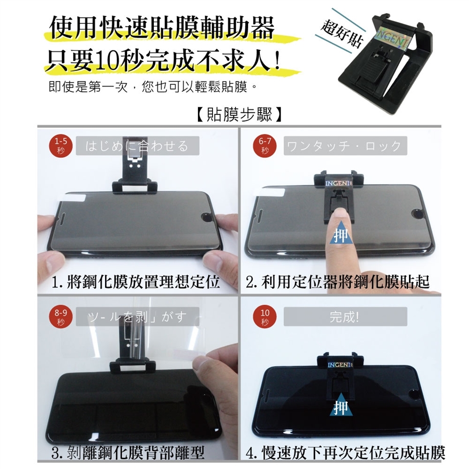 將貼膜器上方與下方之雙面膠離型紙移除,並將手機平貼於貼膜器下方雙面膠位置並與貼膜器固定。接下來將保護貼先放於手機螢幕欲想安裝位置並對位完成(有紅黑(藍)標籤貼面朝下),將貼膜器上方支架往下放,有雙面膠那面與保護貼正面接觸並施壓確認保護貼完全可被貼膜器上方支架之雙面膠黏起。