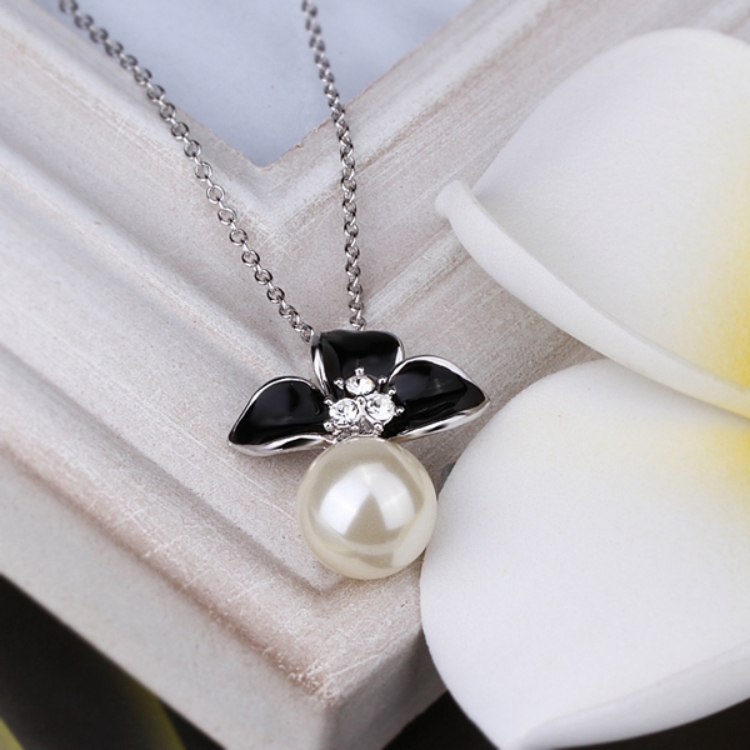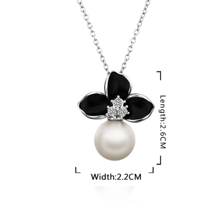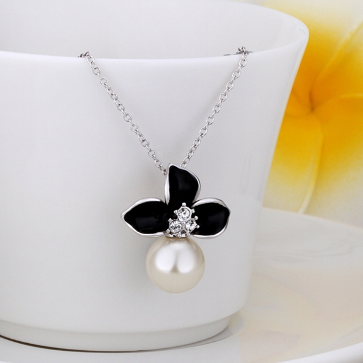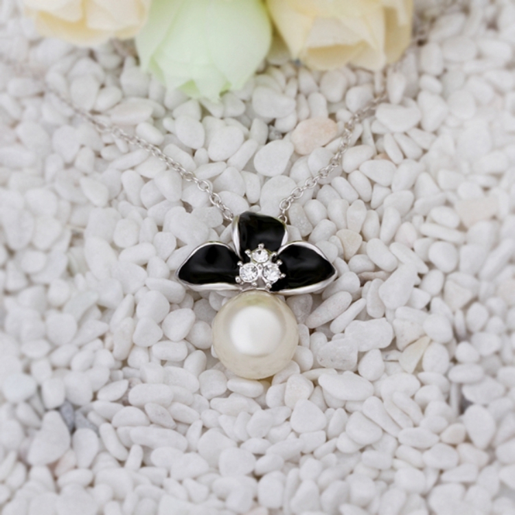 【Aphrodite 愛芙晶鑽】氣質花卉典雅珍珠項鍊 (白金黑色)