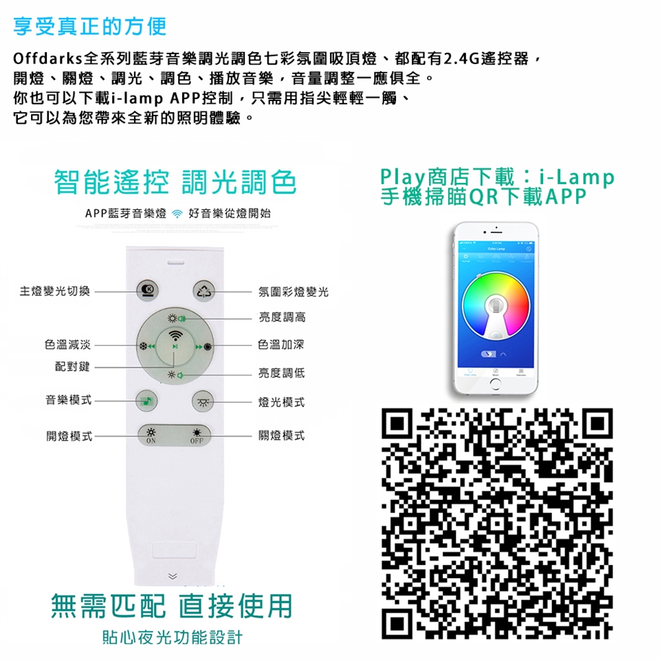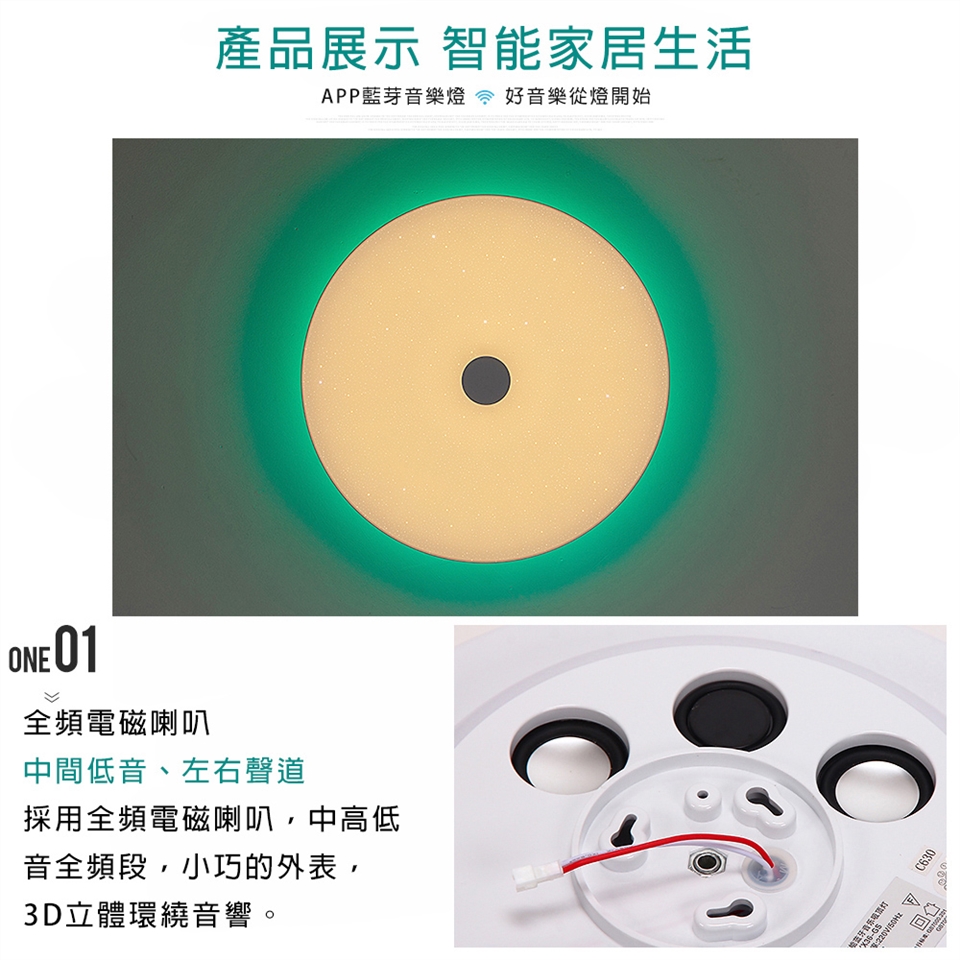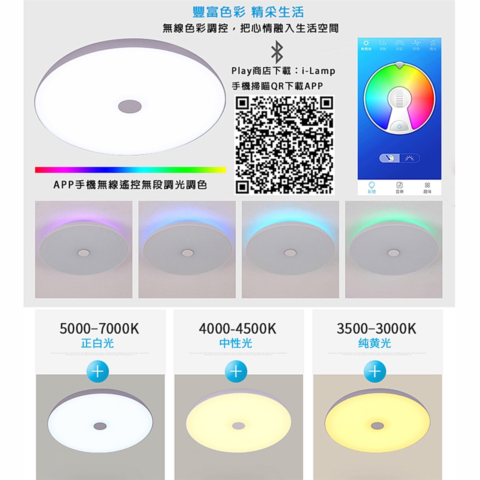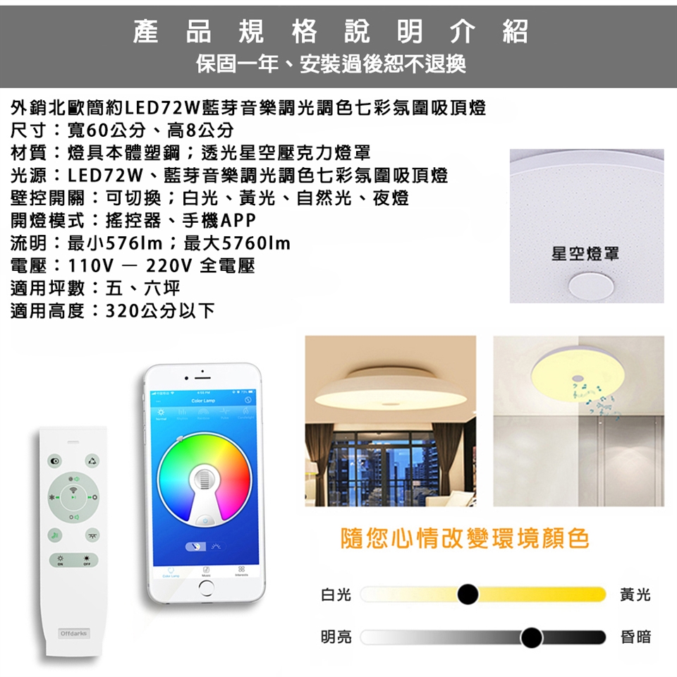 光源:LED72W、藍芽音樂調光調色七彩氛圍吸頂燈