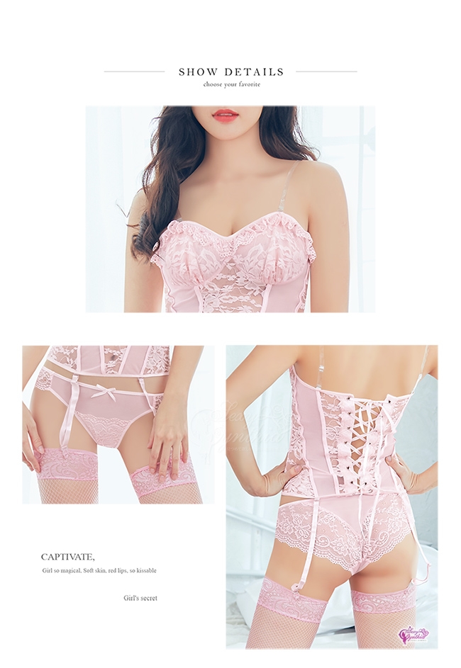此款淺粉蕾絲馬甲吊襪帶五件式組,