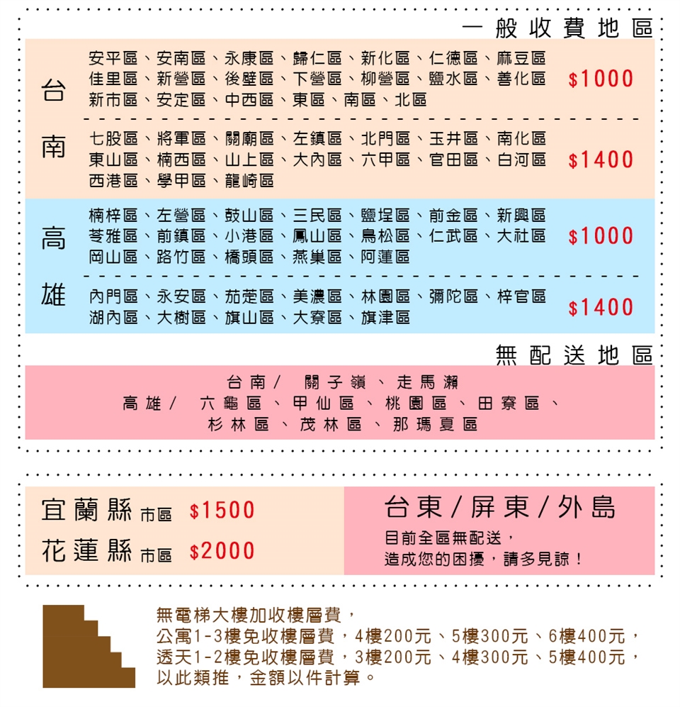 ● 下單後,收到您訂單的1~3個工作天內,將有專人與您確認訂單細節(品項、地址、樓層費、運費),請務必確保電話暢通。