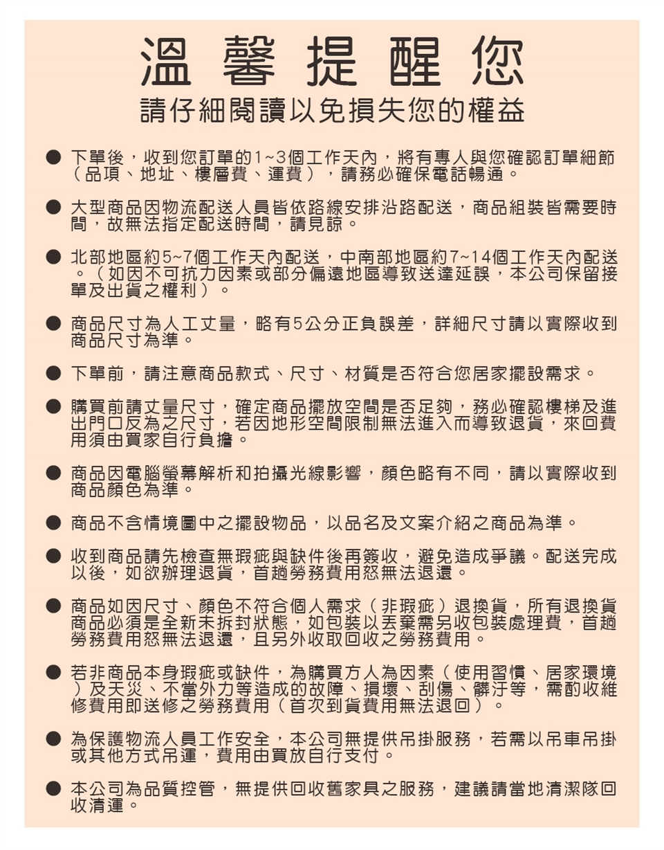 ● 購買前請丈量尺寸,確定商品擺放空間是否足夠,務必確認樓梯及進出門口反為之尺寸,若因地形空間限制無法進入而導致退貨,來回費用須由買家自行負擔。
