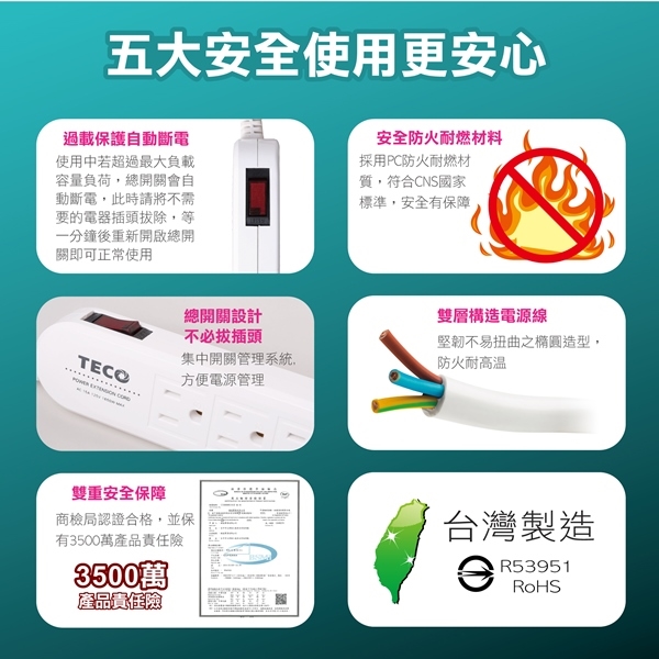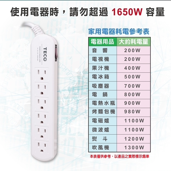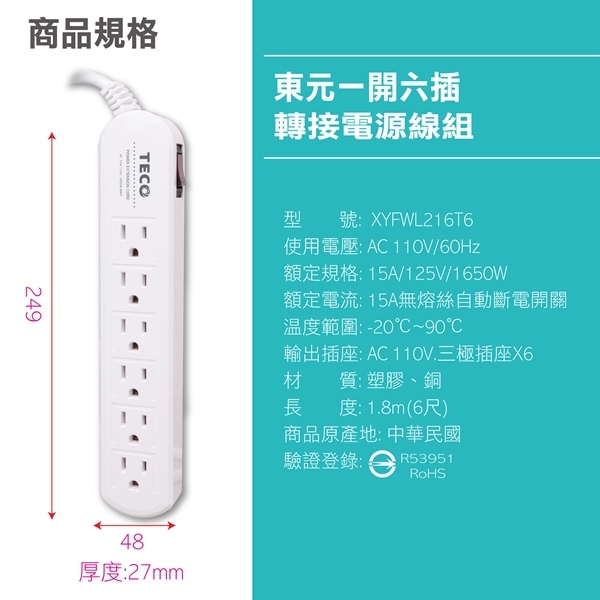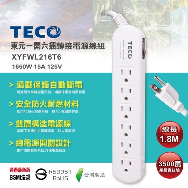 ◎品名:TECO東元 一開四插轉接電源延長線組 XYFWL216T6
