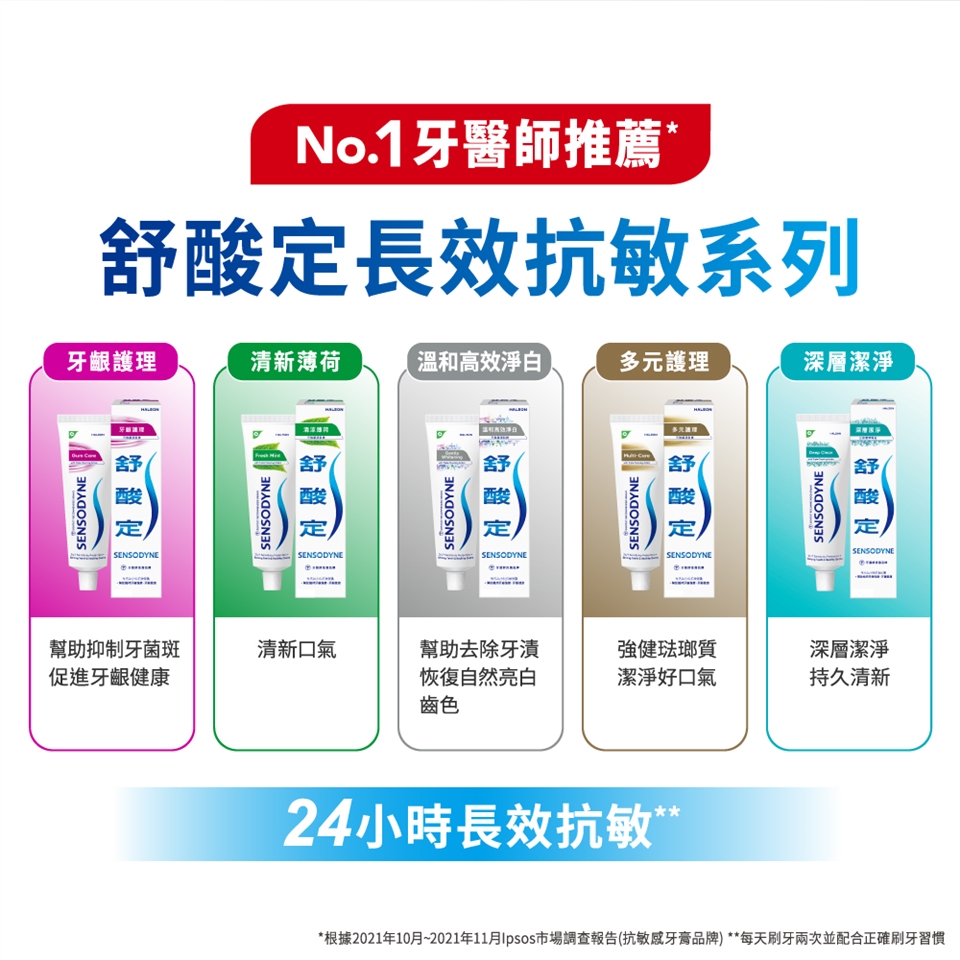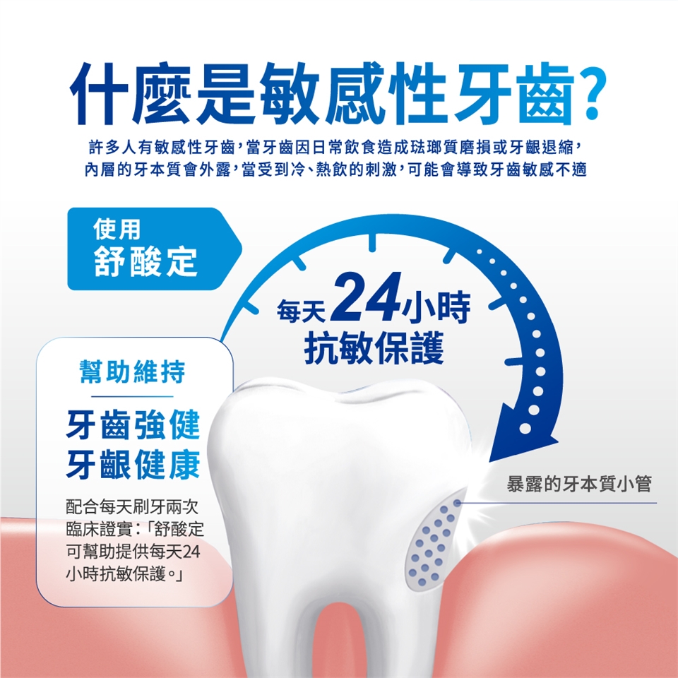 每天使用舒酸定2次,並搭配正確刷牙習慣,便可為牙齒提供每天24小時抗敏保護,