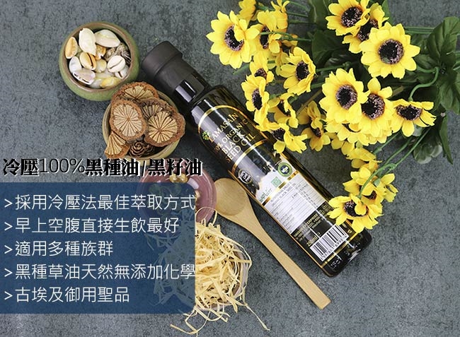 黑種草油來自於黑種草籽,黑種草籽也常被稱為黑茴香、羅馬香菜、黑孜然、黑香菜籽等。3300年前的古埃及最早紀錄黑種草的栽種與使用方法,當時黑種草籽油被譽為「法老的黃金」,它的存在象徵永恆的生命與循環重生,只有貴族有權使用。本產品使用物理方法直接冷壓萃取,可早上空腹生飲。油質清爽純淨呈透明水潤狀。