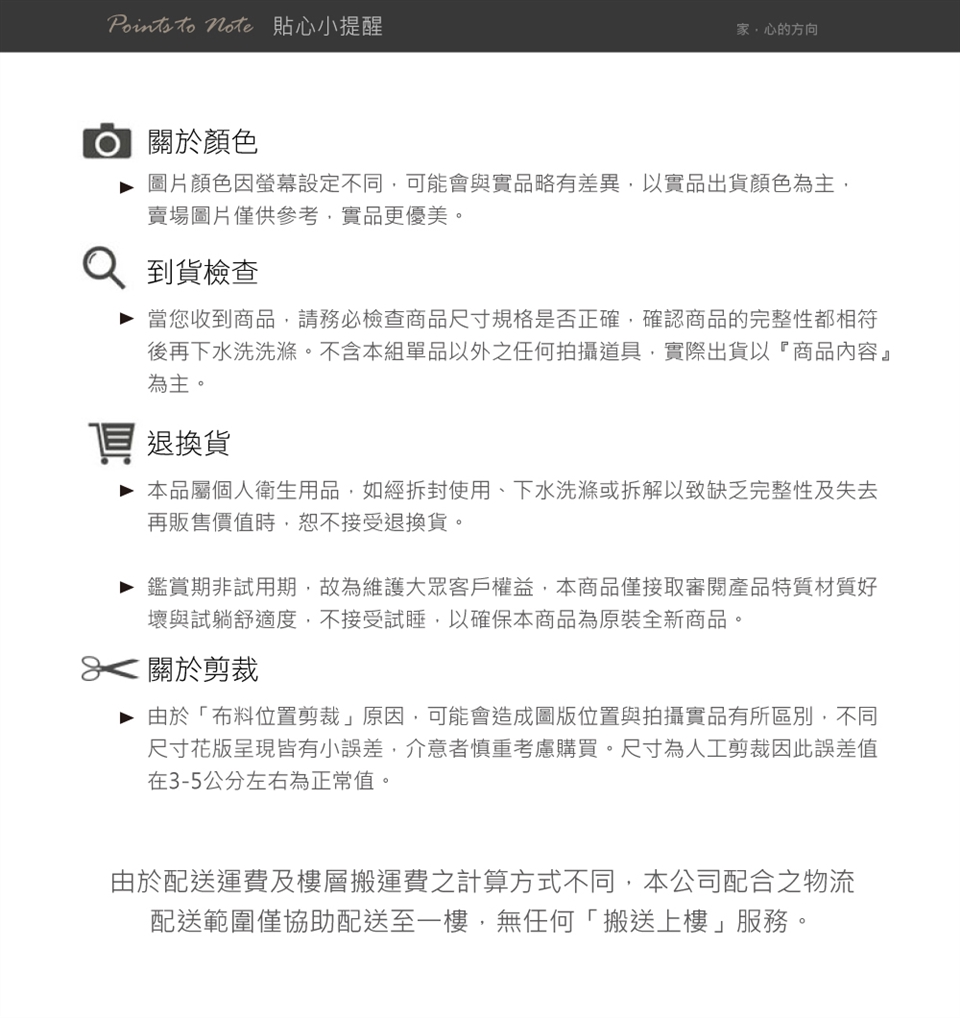 ※如商品因試睡、洗滌等等...產生異味與明顯使用痕跡 恕不接受退換貨。
