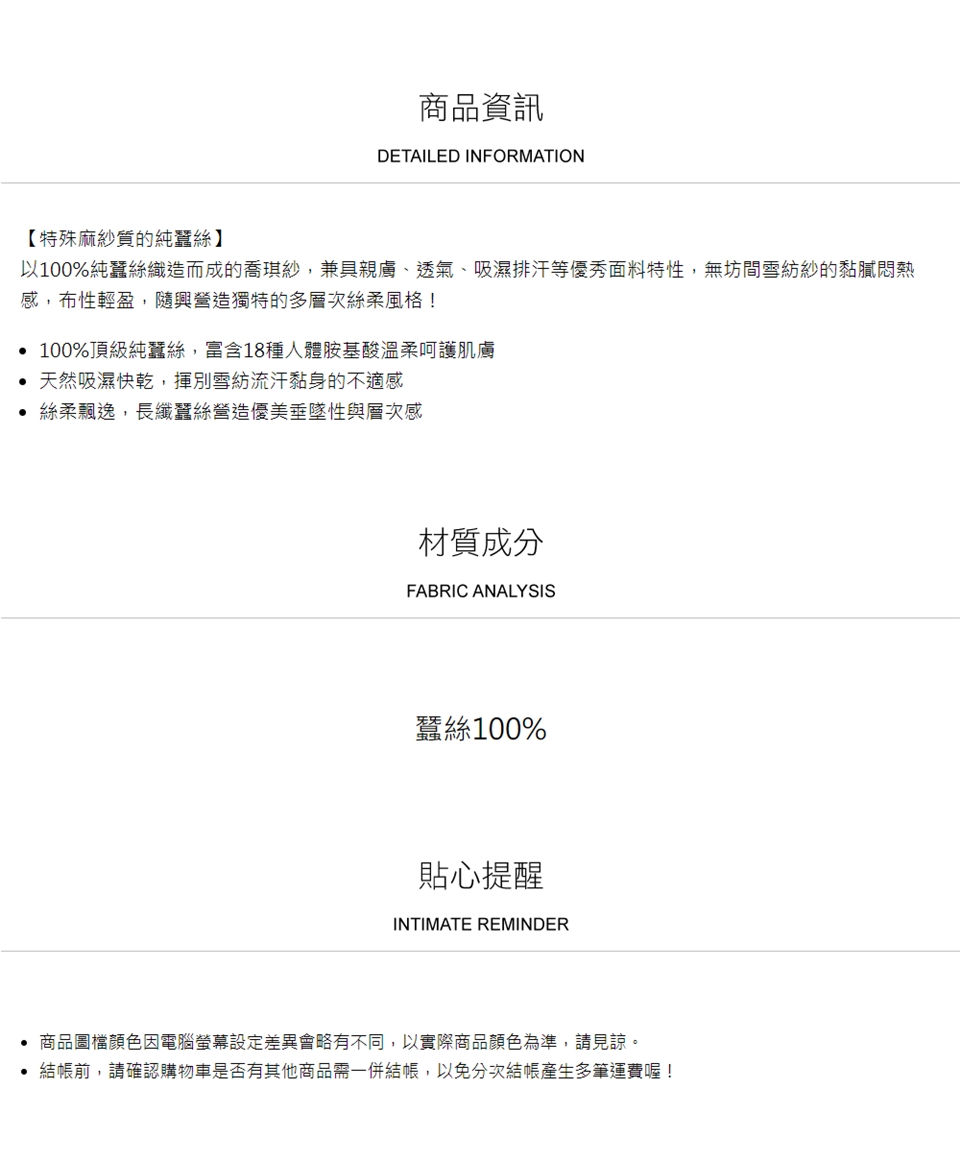 ► 請避免於太陽直射處曝曬,避免蠶絲纖維損壞。