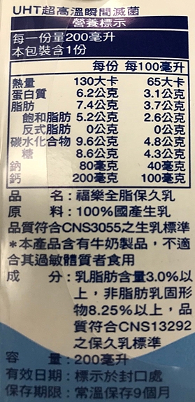 內容物成份 乳脂肪含量3.0%以上,非脂肪乳固形物8.2%以上,品質符合CNS13292之保久乳標準