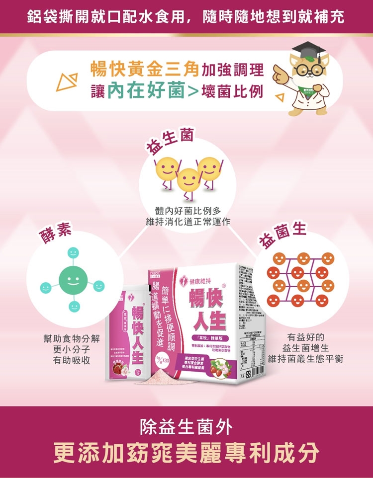 | 內容物成份 | 複合乳酸菌粉{乳糖醇(甜味劑)、氧化鎂、砂糖、羧甲基纖維素鈉、乳酸菌粉【乳酸菌(專利植物乳桿菌Lactobacillus plantarum、鼠李糖乳桿菌Lactobacillus rhamnosus )、麥芽糊精、微結晶狀α-纖維素】、比菲德氏龍根菌粉Bifidobacterium longum(比菲徳氏龍根菌、玉米來源可溶性纖維)、凝結芽孢桿菌粉Bacillus coagulans(麥芽糊精、凝結芽孢桿菌粉)、納豆芽孢桿菌粉Bacillus subtilis(麥芽糊精、納豆芽孢桿菌、玉米來源可溶性纖維)、紅麴色素、ß-胡蘿蔔素【麥芽糊精、阿拉伯膠、中鏈三酸甘油酯、蔗糖、L-抗壞血酸鈉(抗氧化劑)、ß-胡蘿蔔素、二氧化矽、生育醇(維生素E;抗氧化劑) 】}、綜合消化酵素粉{乳糖醇(甜味劑)、氧化鎂、砂糖、羧甲基纖維素鈉、專利AES大豆發酵粉【大豆發酵萃取粉(含蛋白質分解酶、澱粉分解酶、脂解酶、纖維分解酶)、氧化鎂、乳酸鈣、葡萄糖酸鋅、葡萄糖酸錳】、紅麴色素、ß-胡蘿蔔素【麥芽糊精、阿拉伯膠、中鏈三酸甘油酯、蔗糖、L-抗壞血酸鈉(抗氧化劑)、ß-胡蘿蔔素、二氧化矽、生育醇(維生素E;抗氧化劑)】}、砂糖(砂糖、二氧化矽)、異麥芽寡糖、草莓果汁粉{砂糖、草莓果汁粉(草莓濃縮汁、麥芽糊精、辛烯基丁二酸鈉澱粉、砂糖)、辛烯基丁二酸鈉澱粉、麥芽糊精、檸檬酸、檸檬酸鈉、草莓香料、蘋果酸、ß-胡蘿蔔素【麥芽糊精、阿拉伯膠、中鏈三酸甘油酯、蔗糖、L-抗壞血酸鈉(抗氧化劑)、ß-胡蘿蔔素、二氧化矽、生育醇(維生素E;抗氧化劑)】、胭脂紅}、乳糖、氧化鎂(氧化鎂、砂糖、羧甲基纖維素鈉)、專利難消化性麥芽糊精(膳食纖維)、乳糖醇【乳糖醇(甜味劑)、羧甲基纖維素鈉】、檸檬酸、專利小麥精華(水溶性膳食纖維)、草莓香料粉【辛烯基丁二酸鈉澱粉、麥芽糊精、草莓香料(香料、丙二醇)、脂肪酸甘油酯、維生素E(抗氧化劑)】、木寡糖、三層包埋複合乳酸菌粉末【麥芽糊精、乳酸菌(麥芽糊精、Lactobacillus casei、Lactobacillus plantarum、Bifidobacterium lactis、Streptococcus thermophilus、Lactobacillus acidophilus)】、專利草莓籽萃取物(糊精、草莓籽萃取物)、玫瑰果萃取物(玫瑰果萃取物、麥芽糊精)、果膠【蔗糖、果膠(柑橘)、洋菜】 *食品過敏原:本產品含有大豆及牛奶製品 *注意事項:"1.0~6歲幼兒及重大疾病或孕婦、哺乳婦女不宜食用。2.本產品可能引起孩童過敏。3.不能飲用葡萄柚原汁之用藥者應特別注意。4.本產品非藥品,供保健用,罹病者仍需就醫。" |