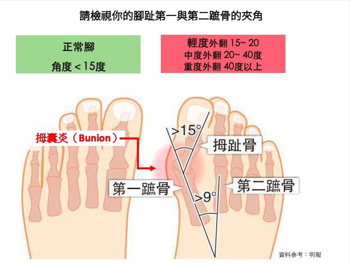 拇趾/拇指外翻發生原因:遺傳、韌帶鬆弛、體重過重、鞋子前楦頭太窄、扁平足者⋯⋯