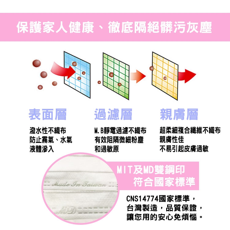 ◆過濾層:M.B靜電過濾不織布,有效阻隔微細粉塵和過敏原。