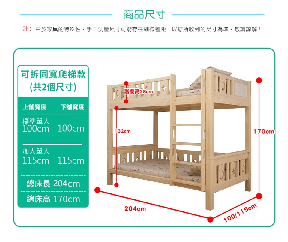 上鋪寬度100公分,下鋪寬度100公分,總長度204公分,床總高度170公分