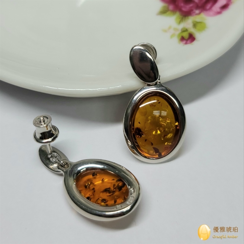 來自波羅地海 橢圓形干邑琥珀 含優美珀花 銀質耳環