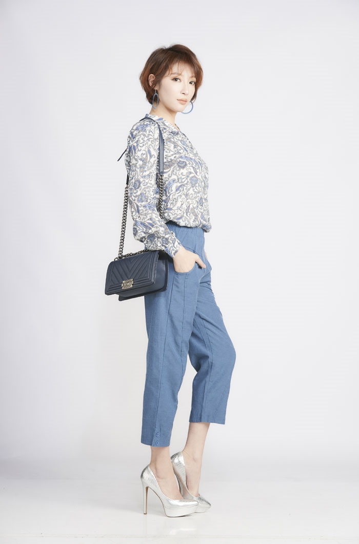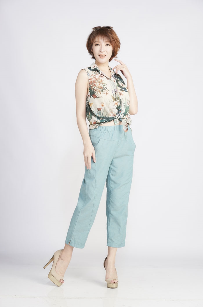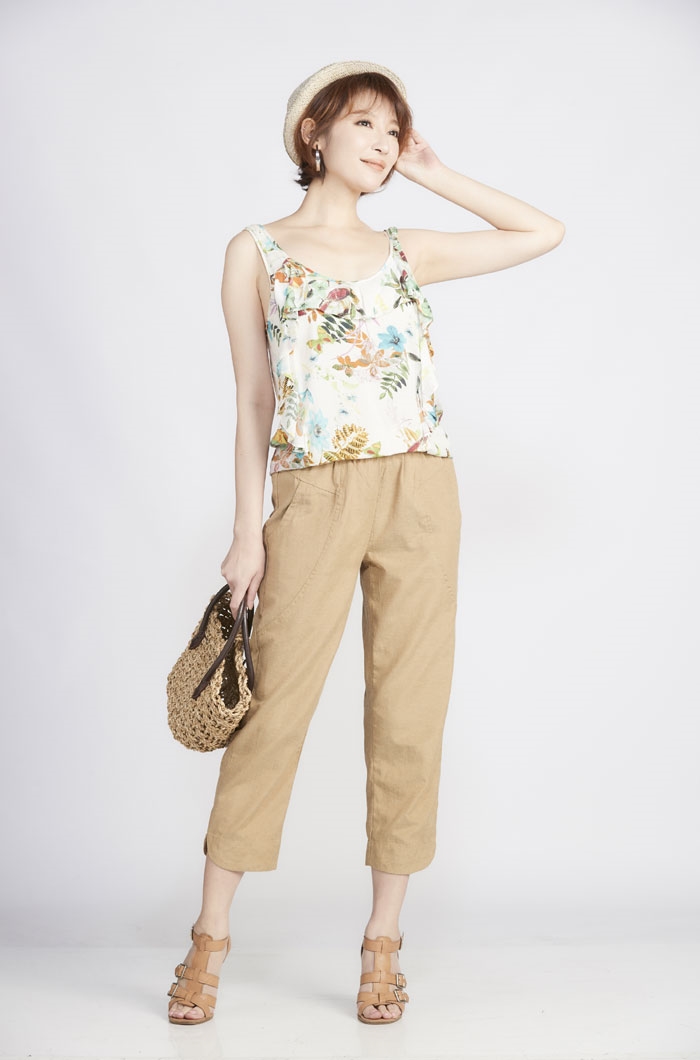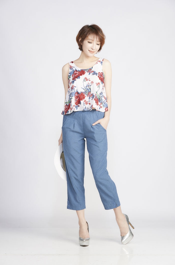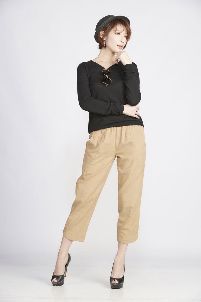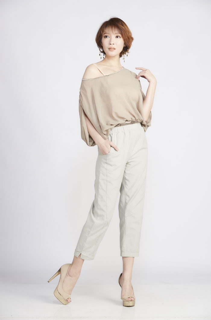 03.褲款以簡單俐落造型為主,於臀圍及大腿部份採用寬版剪裁增加穿著舒適度及修飾性,褲管作縮