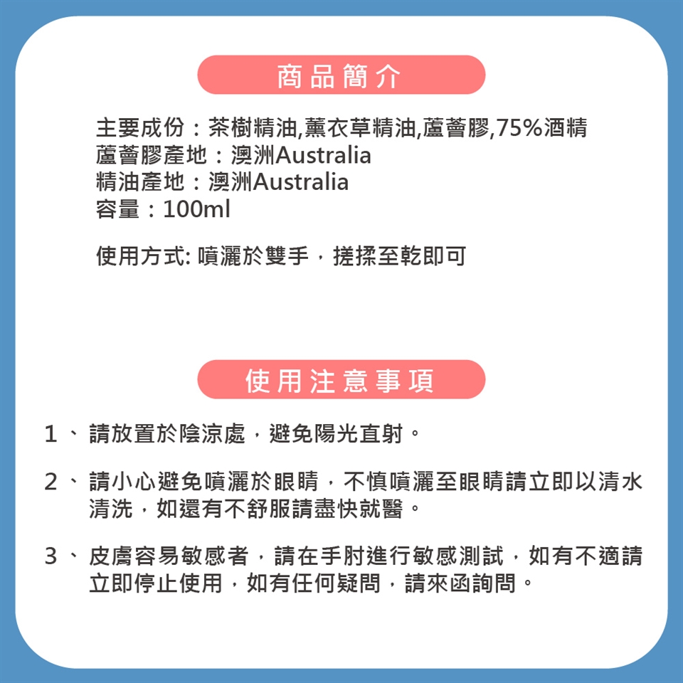 成分:茶樹精油、薰衣草精油、蘆薈膠、75%酒精
