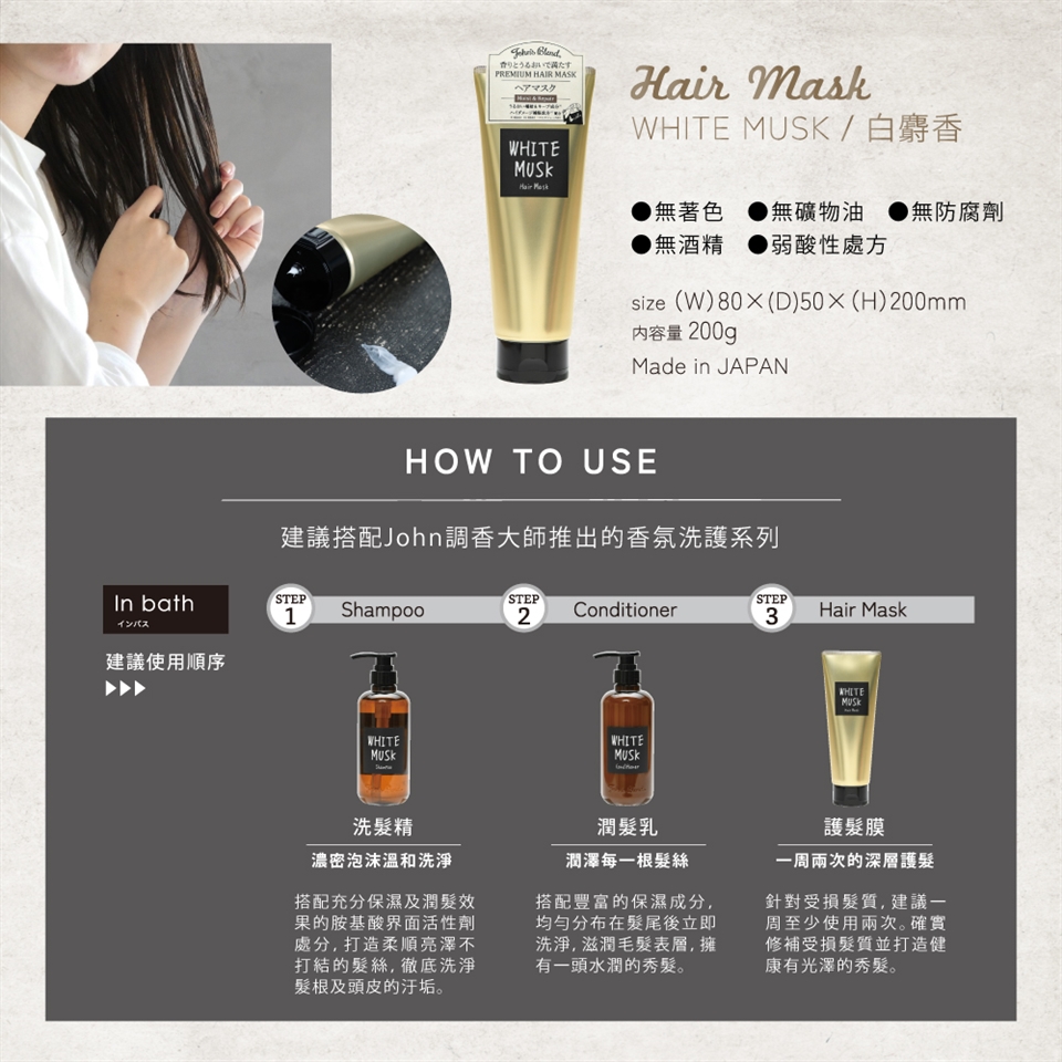 護髮膜:使用完洗髮精後,取適量於手掌上,均勻沾抹於髮絲上數分鐘後再以清水洗淨。建議一週使用2~3次,特別是受損髮質可在潤髮後使用。