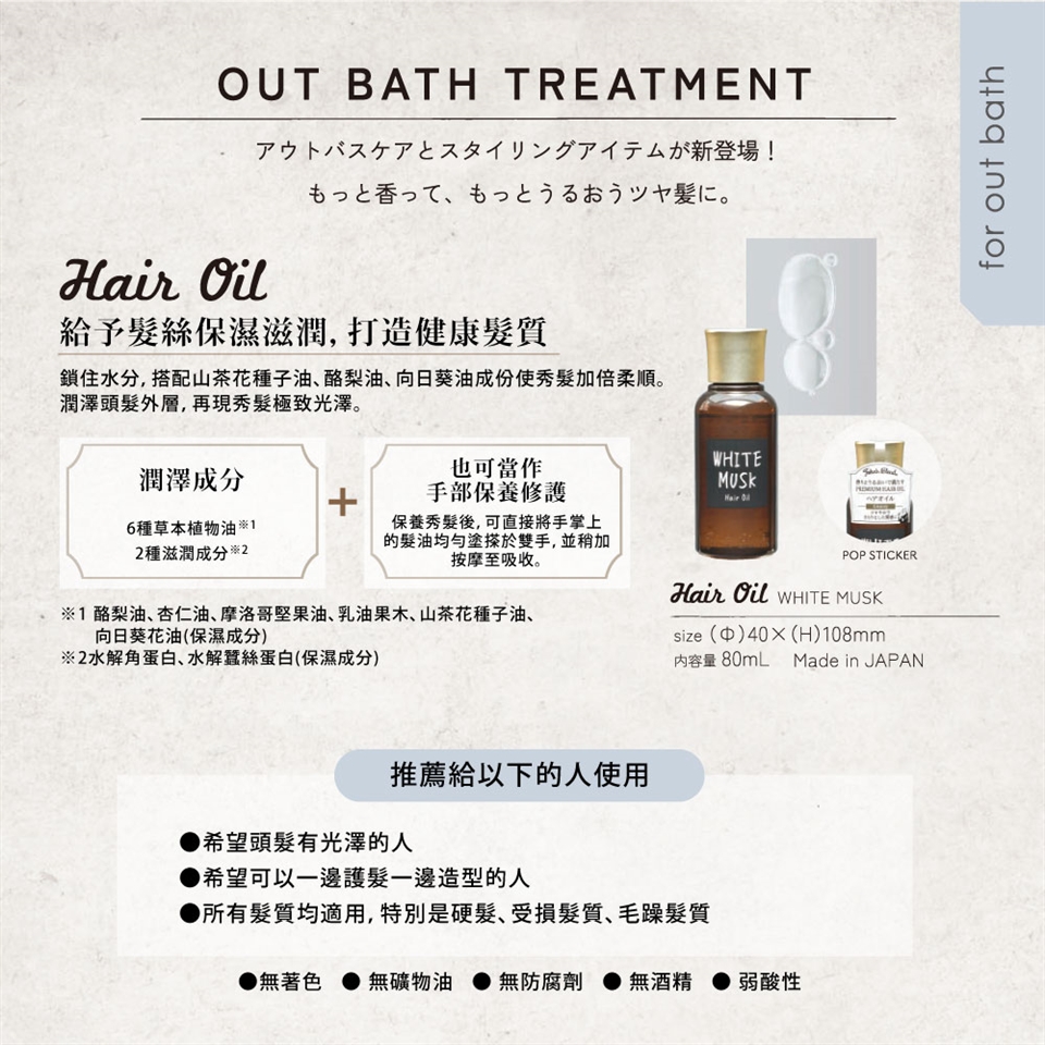 護髮油:取適量於手掌上,均勻沾抹於髮尾上。頭髮半乾或全乾時都可以使用。