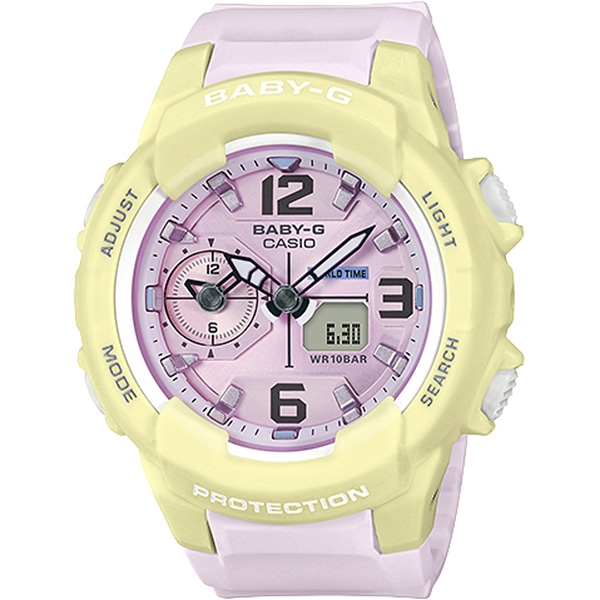 春意盎然的季節即將到來,BABY-G推出粉嫩輕柔的BGA-230新色,採用粉嫩雙色混搭設計,活潑的配色展現春天的活力感,共有水藍X粉紅,粉紫X粉藍及鵝黃X粉紫三種配色。全系列在錶盤上特別放大了12點、3點及6點鐘刻度,除增添設計感外,更提高了閱讀性,而實用的雙錶盤兩地世界時間功能,可於主要指針與9點鐘方向錶眼同時顯示兩地的時間資訊,出國旅遊時也能輕鬆掌握兩地時間,按壓4點鐘方向按鈕即可快速切換兩地時間,全系列具耐衝擊及防水100米,搭載48個城市的世界時間、計時碼錶、倒數計時、鬧鈴…等多項功能。
