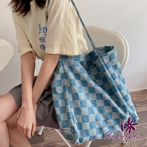 【iSPurple】牛仔格紋*水洗大容量購物手提肩背帆布包