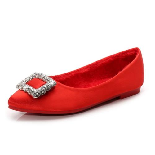 【JP Queen New York】美麗新娘方扣水鑽尖頭女平底低跟鞋(紅色)