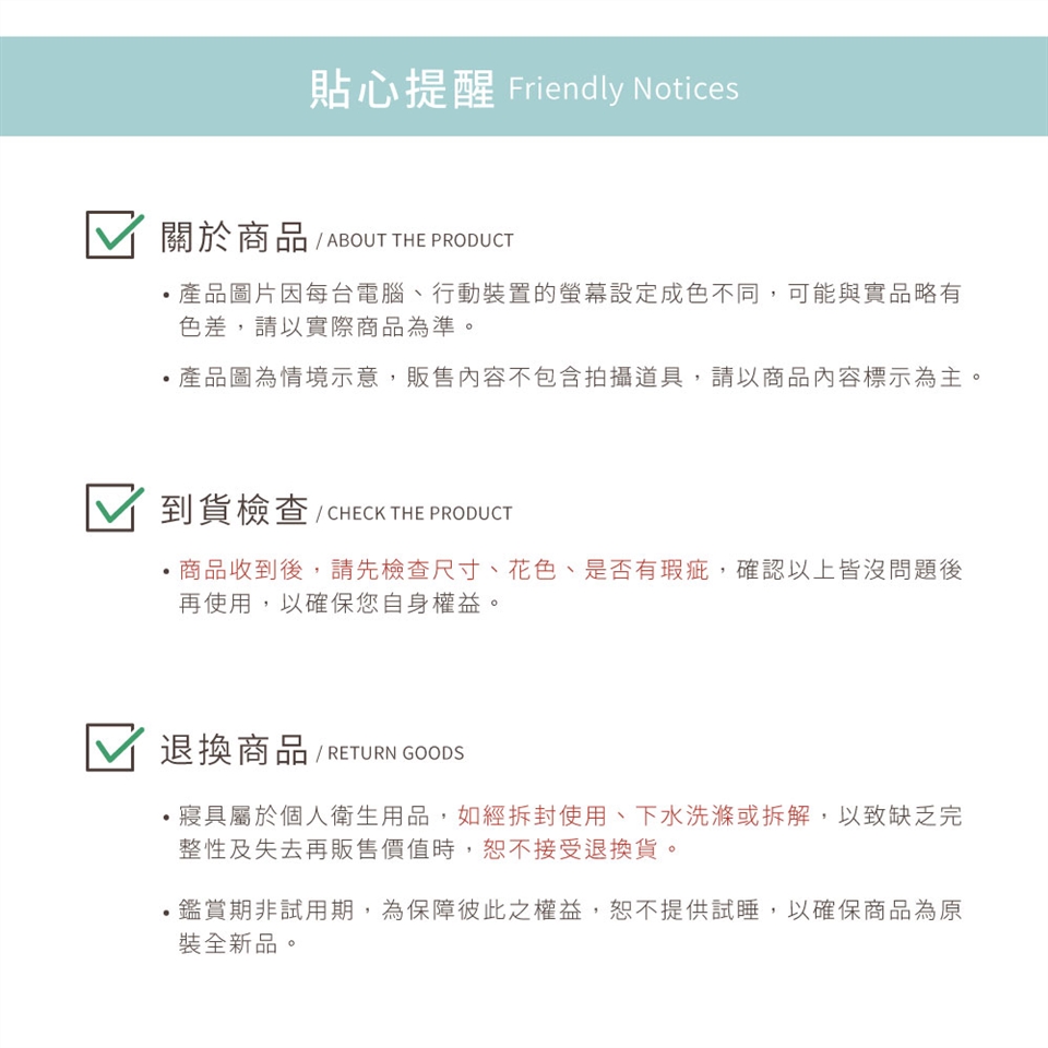 ▪ 商品收到後,請先檢查尺寸、花色、是否有瑕疵,確認沒問題後再使用,以確保您自身權益。