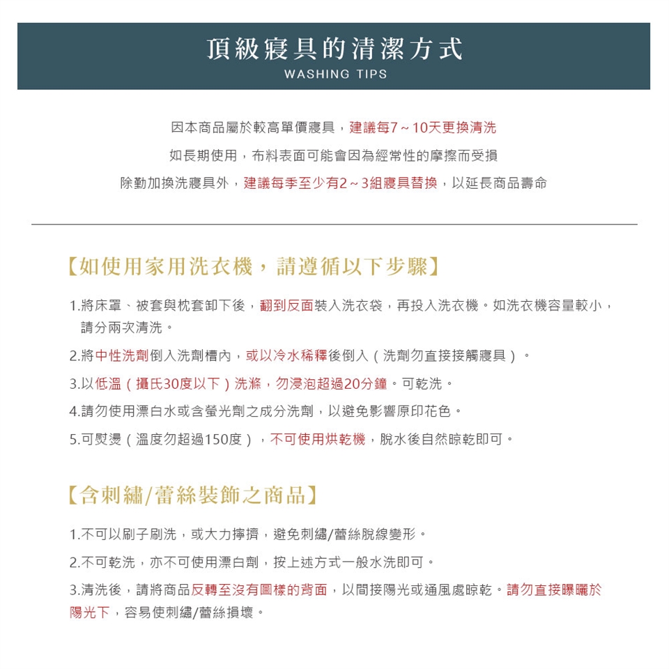 因本商品屬於較高單價寢具,建議每7~10天更換清洗,如長期使用,布料表面可能會因為經常性的摩擦而受損。除勤加換洗寢具外,建議每季至少有2~3組寢具替換,以延長商品壽命。