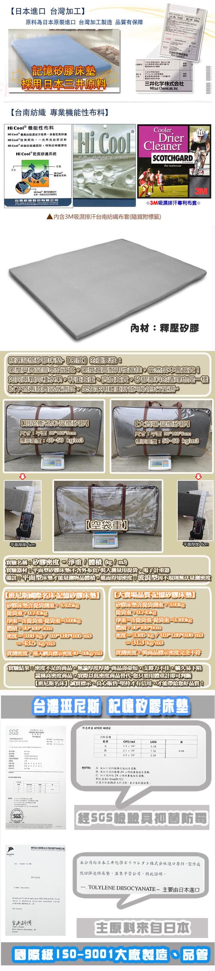 3.材質:全平面感溫釋壓矽膠(原料日本三井化學、密度40~50kg/立方米)3M吸濕排汗台南紡織布套(附3M標籤)
