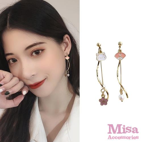 【MISA】韓國設計S925銀針甜美可愛貓咪日系元素長款不對稱耳環