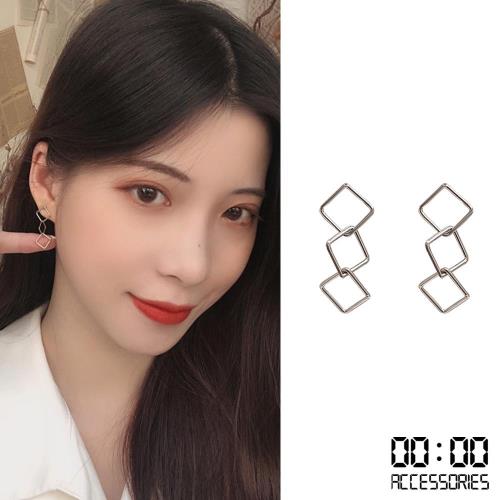 【00:00】韓國設計S925銀針幾何方形縷空線條串鍊耳環