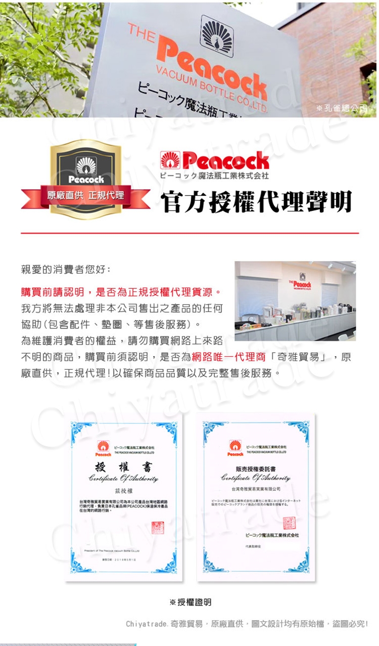 日本孔雀Peacock母公司於1923年創立於大阪,從事保溫瓶生產。與虎牌、象印牌同為日本保溫產品協會成員。