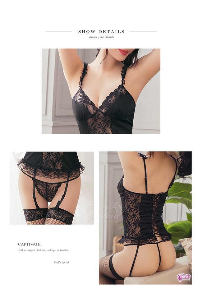 此款黑色系蕾絲美背馬甲四件組,
