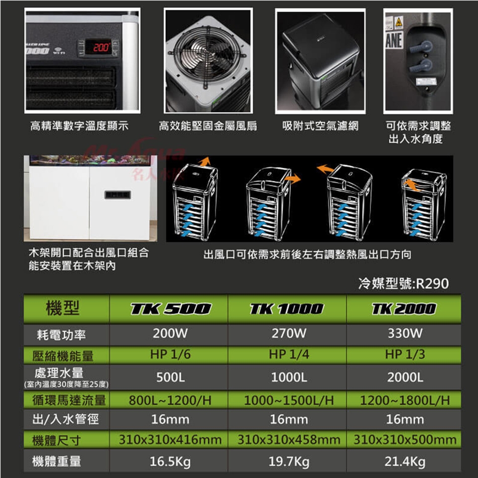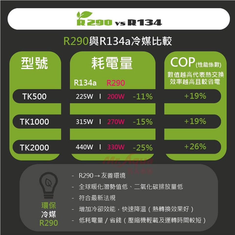 1. 使用最新R290環保冷媒,提供強大的冷卻效能,同級冷卻機最省電之機種。
