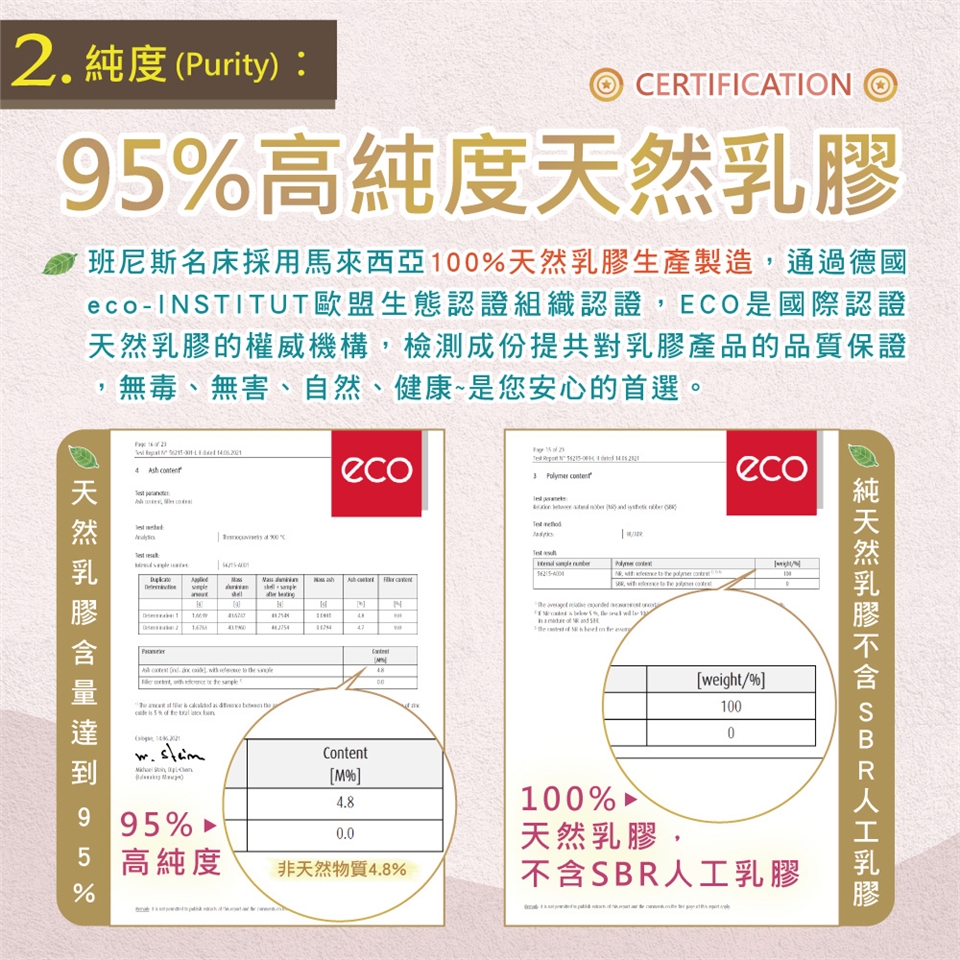 ‧【馬來原廠送檢德國ECO檢測成品膠含量約90%、膠含量內為100%天然乳膠( NR=Natural Rubber )、0%人工乳膠(SBR)】