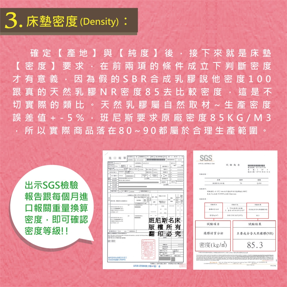 『乳膠純度』:本款為100%馬來西亞天然乳膠原料製品、經SGS檢驗為天然乳膠、密度約 85公斤/立方米