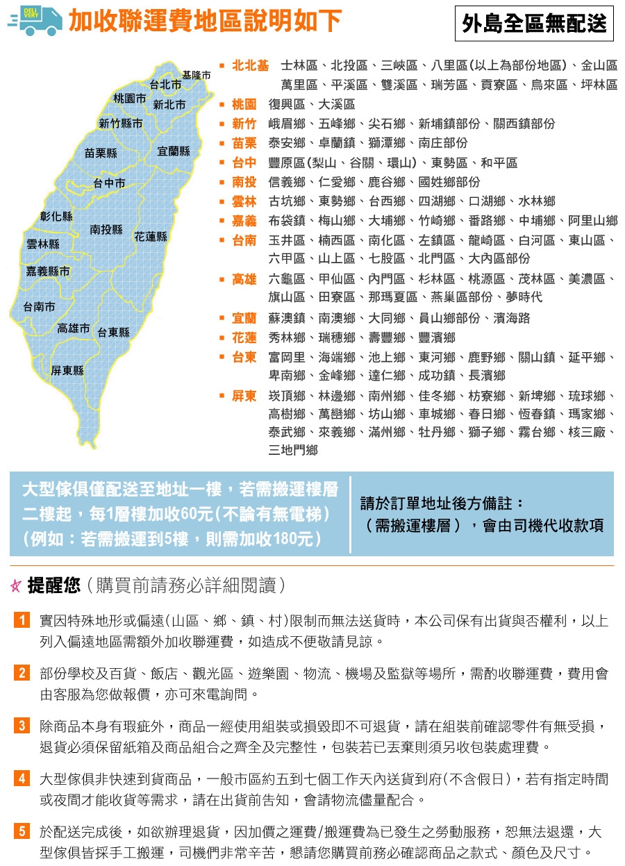 3.如須運送至偏遠山區鄉鎮等地區須酌收運費,運費由本公司貨運部門評估,若有退貨之情形加購運費恕無法退還。