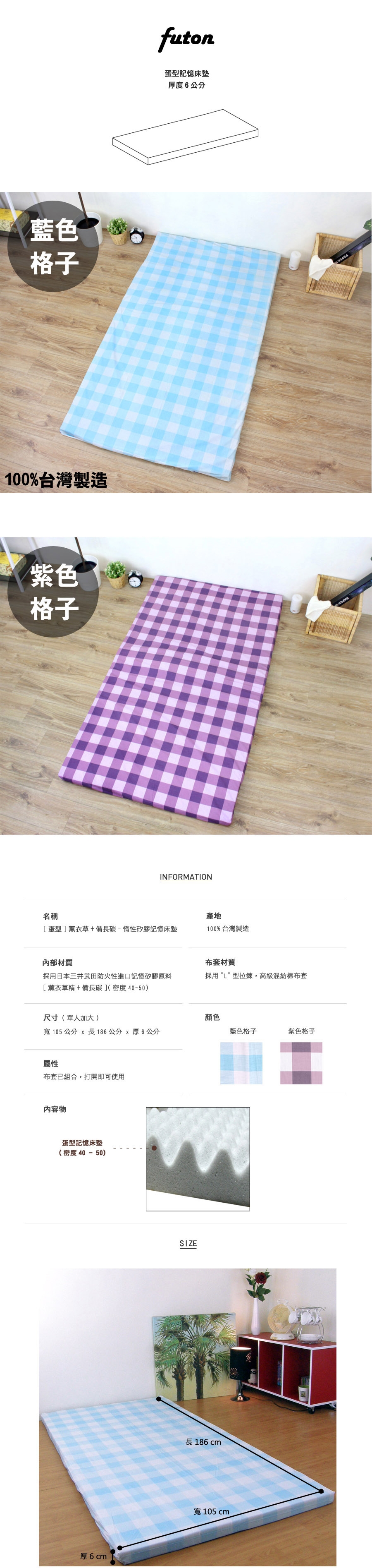 [蛋型]3.5呎x6.2呎[厚6公分]單人加大[密度40-50]薰衣草+備長碳-惰性矽膠記憶床墊(附布套)-(額外再加送一個布套(隨機出貨)=共2個布套)