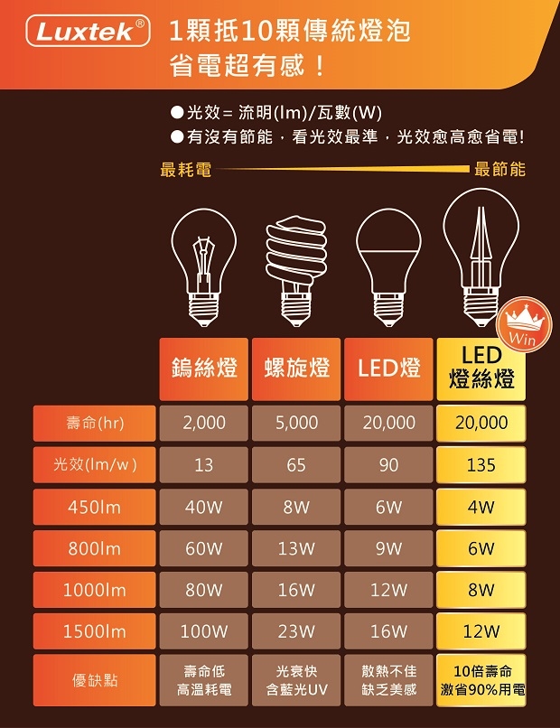 (光效遠超越市售LED燈泡35%、螺旋燈泡55%、鹵素燈90%)