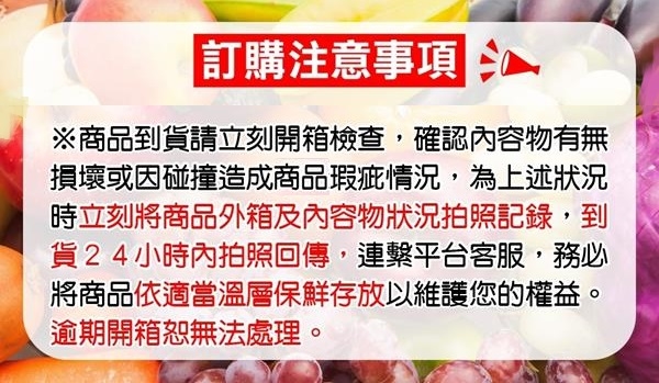 7.水果/生鮮商品根據消保法規,不適用於7天鑑賞期退貨。 商品標示規格、重量、等級裝箱配送不得以其他主觀認知差距個人口感、顏色、大小等理由退貨。
