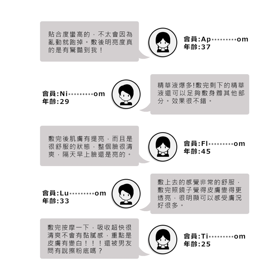 *徹底潔面後取面膜撕開鋁箔,將面膜完全服貼於臉上,10-15分鐘完全吸收取下即可