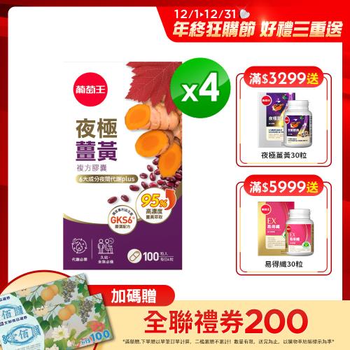 葡萄王 夜極薑黃100粒*4瓶(共400粒)(95%高含量薑黃萃取物特添紅豆種皮萃取、紅葡萄葉萃取)