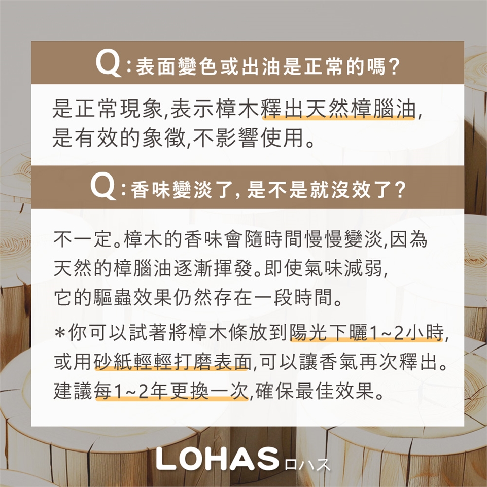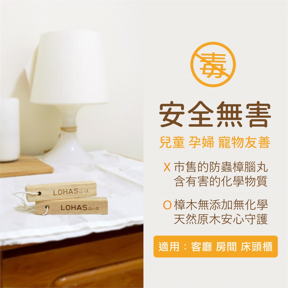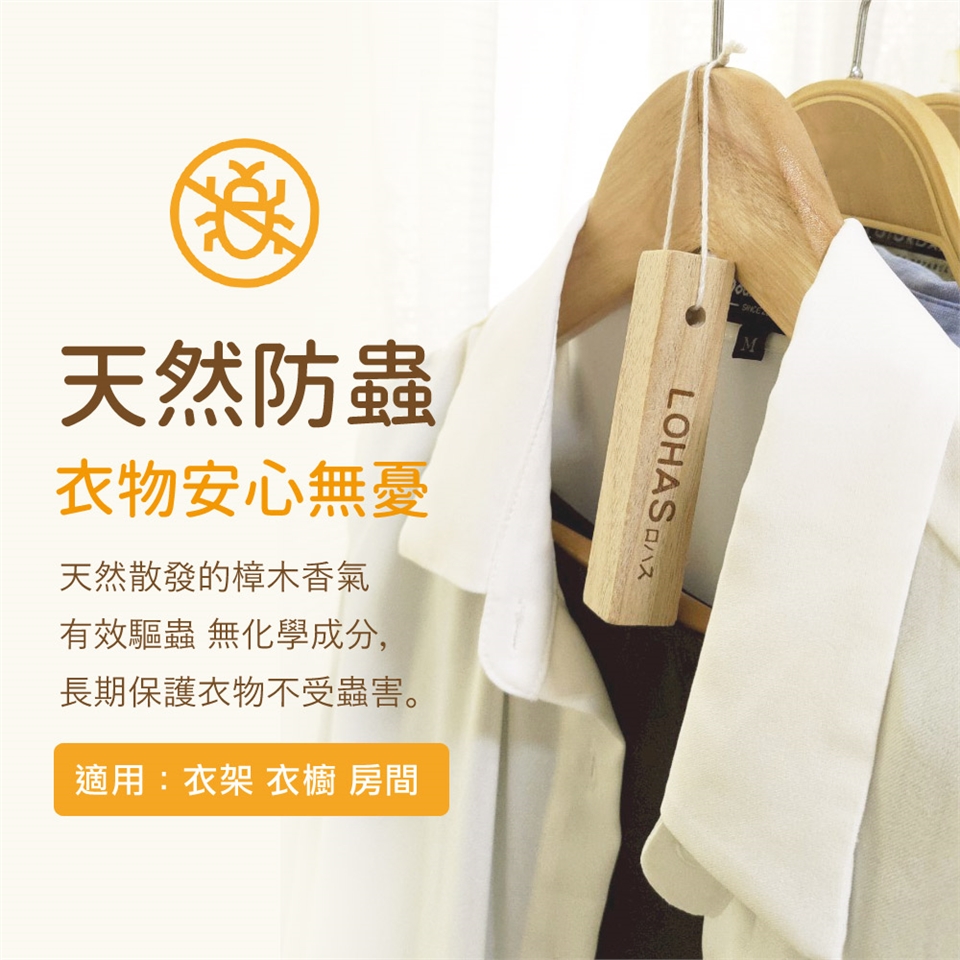 若您還在使用樟腦丸,不妨試試100%純天然全實木樟木棒,也具防潮除濕功能,無化學添加又更天然,吸飽水氣後,放置在陽光處曬乾,還可重覆使用,相當環保不浪費,兼防蟲防蛀、去除異味的用途。