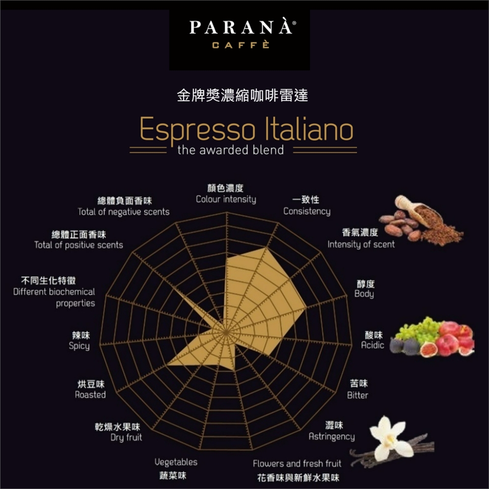 這最佳的阿拉比卡咖啡,其獨特之處是只能從完全手工的生產而來,是PARANA精品莊園咖啡的完美代表,幾十年來每分每秒的細心呵護與熱情專注品質的生產,深獲義大利人的喜愛與忠誠,是每日早上的活力來源。