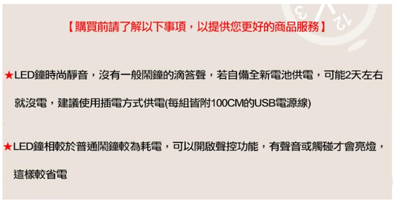 ★LED鐘時尚靜音,沒有一般鬧鐘的滴答聲,若自備全新電池供電可能兩天左右就沒電,建議使用插電方式供電(每組皆附100cm的USB電源線)