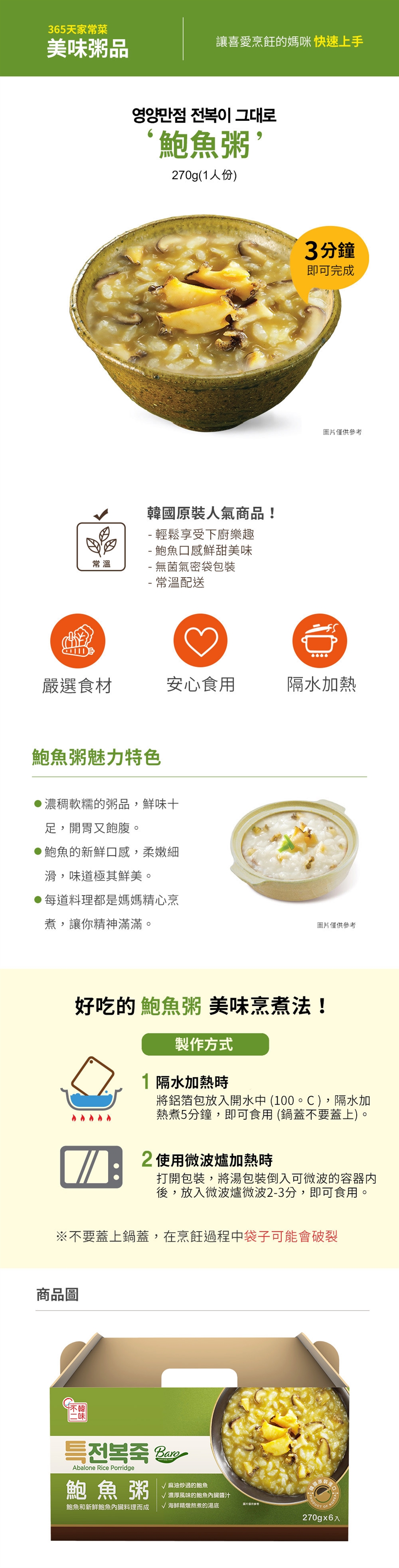 商品詳細介紹 體驗說明 不可體驗 使用方法說明 1.用微波爐,將內容物倒入容器微波(700W)約2分鐘,(1000W)約1分30秒,即可食用 注意事項 ※本產品含有大豆、牛奶、麩質之穀物、蝦、芝麻、螺貝類、甲殼類製品,不適合其過敏體質者食用