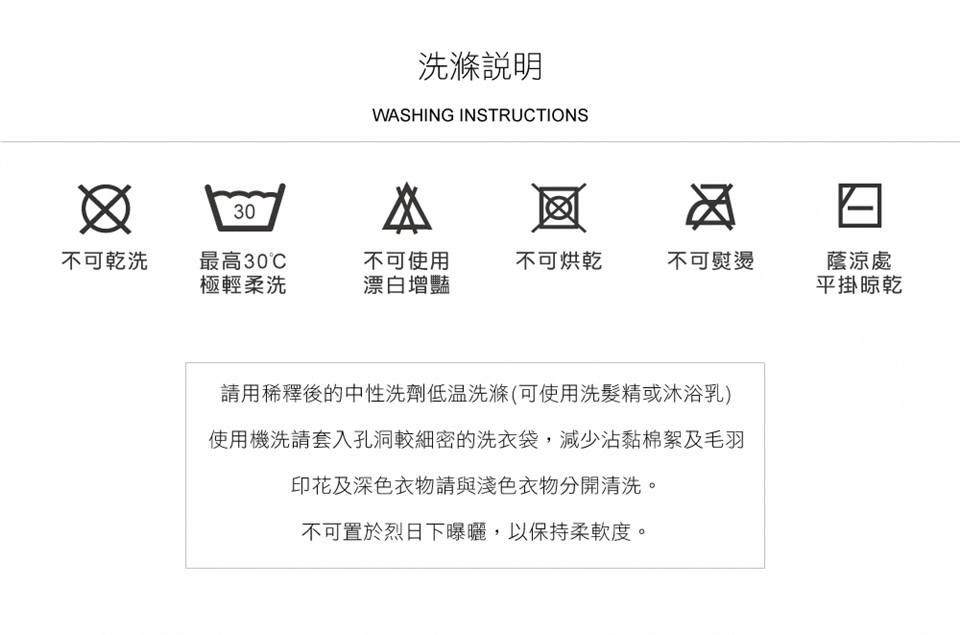 ► 建議可使用洗髮精、沐浴乳(可直接清洗皮膚之清潔產品)或蠶絲專用中性洗劑,使用低溫冷水稀釋過後,不浸泡,輕柔手洗方式進行清潔。